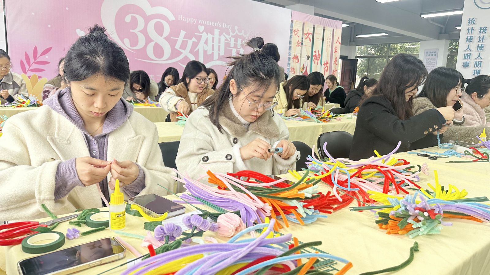 活動(dòng)現(xiàn)場(chǎng),五彩斑斕的花材鋪滿桌面,恰似一片夢(mèng)幻的花海。女神們圍坐一處,笑意盈盈,眸光中滿是對(duì)美的向往與期待。她們巧妙搭配色彩,充分發(fā)揮創(chuàng)作靈感,精心雕琢花束的形狀。每一個(gè)動(dòng)作都飽含著對(duì)美的執(zhí)著追求,每一束花都凝聚著女神們的智慧與巧思。